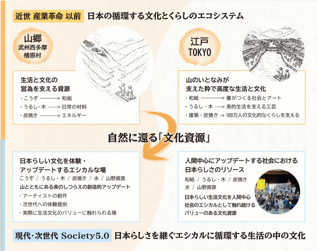 デジタル化が進み、「書く」という行為そのものが日常から減りつつある現代において書が担ってきた生活の美や身体性、思想としての価値を改めて問い直し、日本文化としての「書」を未来へとつなぐ新たな形を探りました。その方法として、江戸・東京と武州の山々を循環して成立してきた書・紙・人のエコシステムに着想し、その循環が今なお息づく東京都檜原村を舞台に、書を中心に「総体の美」を伝統から創造する書家の川邉りえこがクリエイティブディレクターとなり、生活の中の日本文化のトレンドリーダーであった文人の存在を今によみがえらせ結成した「現代文人五人」の書と和紙の創作を中心に、専門家、芸術家、工芸家、地域住民、次世代を担う子どもたちが共創する実践的な取り組みを展開しました。