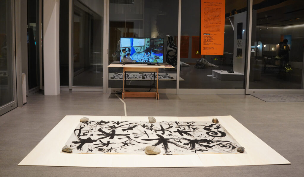 また、会場においては檜原村での取り組みにより生まれた、落合を含む「現代文人」たちの手による複数の書によるアート作品や川邉によるワークショップの成果作品の展示が行われ、「書」を文字表現にとどめず、空間・身体・素材・思想を横断する表現として再解釈する試みが展示されました。